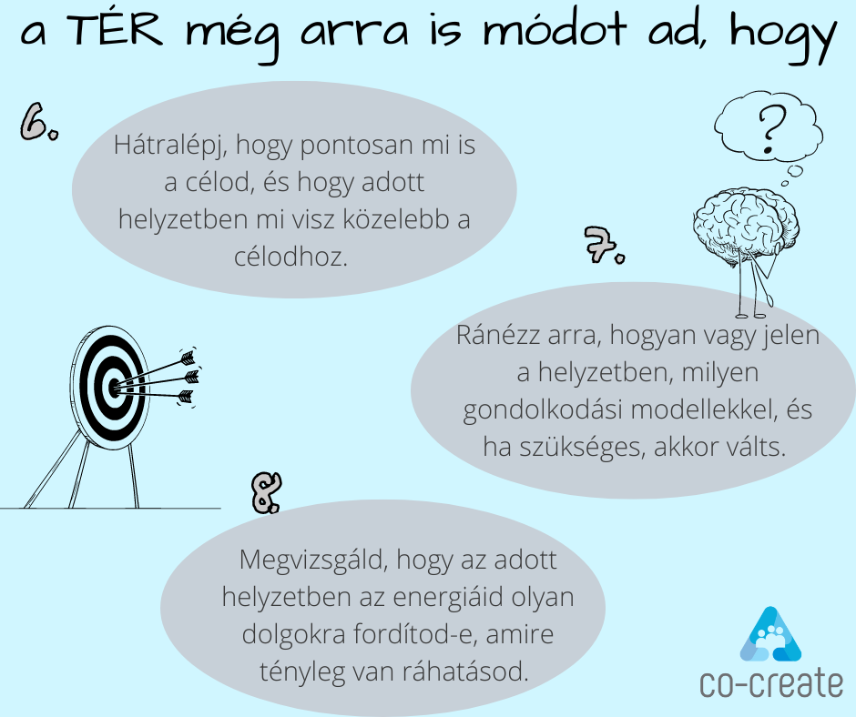- A térben van mód hátralépni, és ránézni a helyzetre kívülről:mi is itt pontosan a célod, és mi visz téged közelebb a célodhoz.