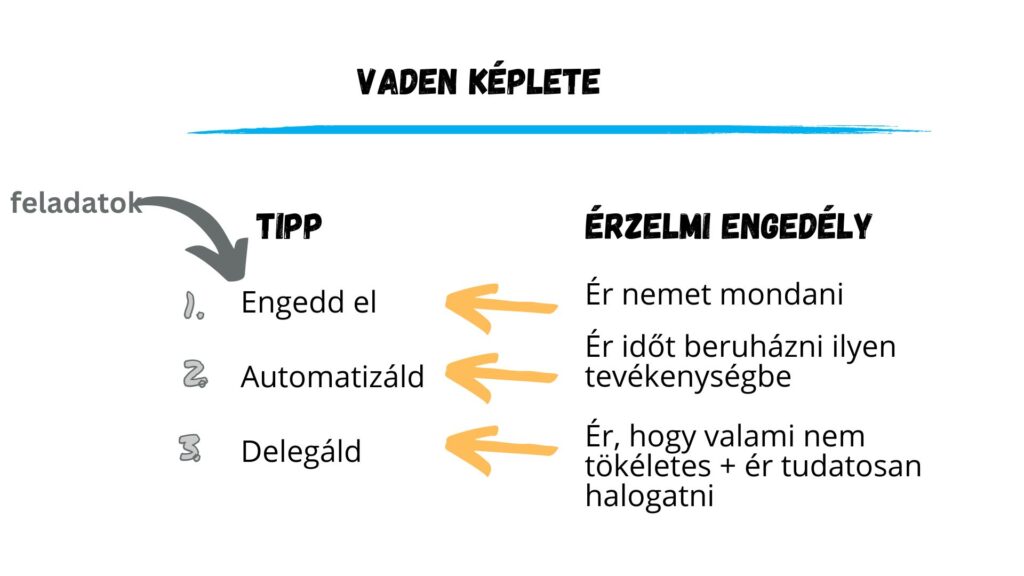 Én plusz egy dologgal kiegészítem még Vaden képletét. Tudatos figyelem arra, hogy milyen feladatok inspirálnak. Azaz, melyek azok a tevékenységek, amelyek folyamatosan visszatermelik az energiát. Érdemes ezekből betenni a mindennapokba annyit, hogy elég lendületet adhassanak az előttünk álló naphoz/héthez.