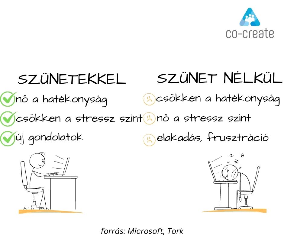 Már csak azért is érdemes elmozdulni a szünetek irányába, mert a szünetek után jobban jönnek a friss, újszerű gondolatok. És nem utolsó sorban 10-ből 9 munkavállaló sokkal inkább dolgozik olyan munkahelyen, ahol bátorítják a munkavállalókat, hogy tartsanak szünetet napközben.